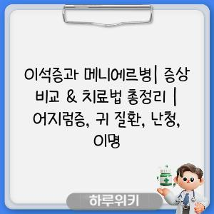 - 추가 증상: 메니에르병은 어지럼증 외에도 난청, 이명, 귀의 압력감 등의 증상이 나타날 수 있습니다. 이석증은 어지럼증이 주 증상이고 다른 증상은 거의 나타나지 않습니다.