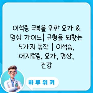 이석증은 갑작스러운 어지럼증을 유발하여 일상생활에 큰 불편을 초래하는 질환입니다. 이석증 극복을 위해 요가와 명상을 활용하는 것은 몸과 마음의 균형을 회복하고 어지럼증을 완화하는 데 효과적입니다. 이 가이드에서는 이석증 증상 완화에 도움이 되는 5가지 요가 동작을 소개하고, 각 동작과 함께 균형 감각을 향상시키고 심신 안정을 도모하는 명상법을 제시합니다.