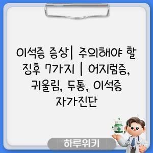 본문에서는 이석증의 주요 증상과 함께 이석증을 의심할 수 있는 7가지 징후에 대해 자세히 알아보고, 이석증 자가진단 방법까지 소개합니다. 또한, 어지럼증, 귀울림, 두통 등 이석증과 관련된 다양한 증상에 대해서도 다룹니다.